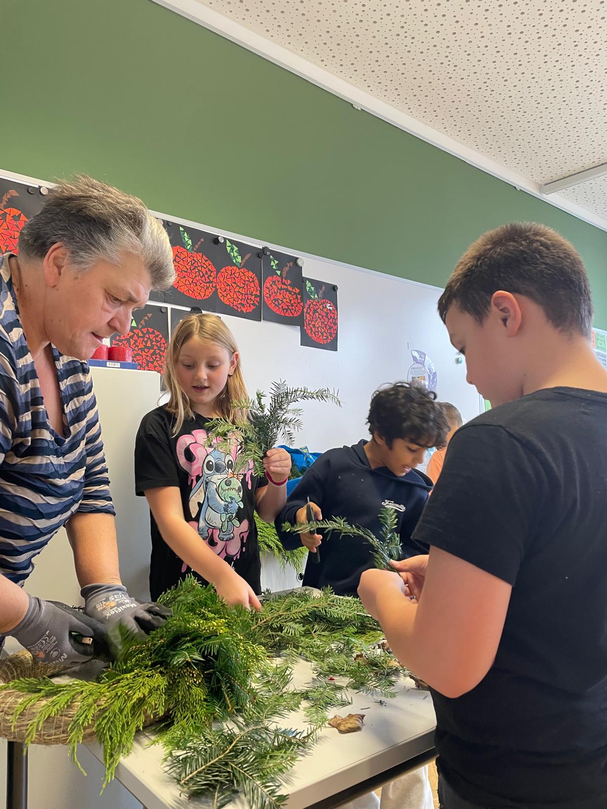 Adventkranzbinden in der 3b Draußen schneit es dicke Flocken, genau der richtige Zeitpunkt zum Adventkranzbinden mit Helenes Oma. Herzlichen Dank an Frau Heidi Buder für den tollen Kranz! Unsere Freude ist riesig!