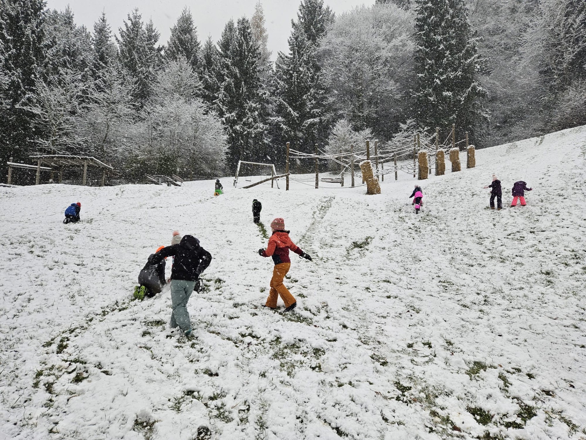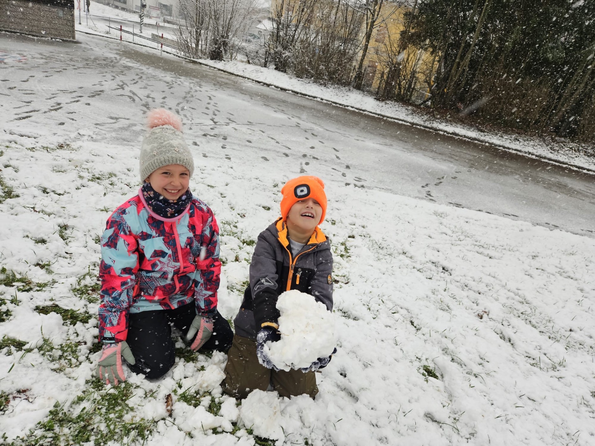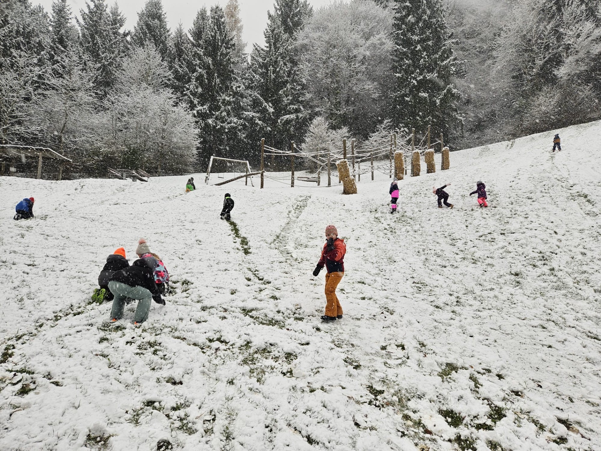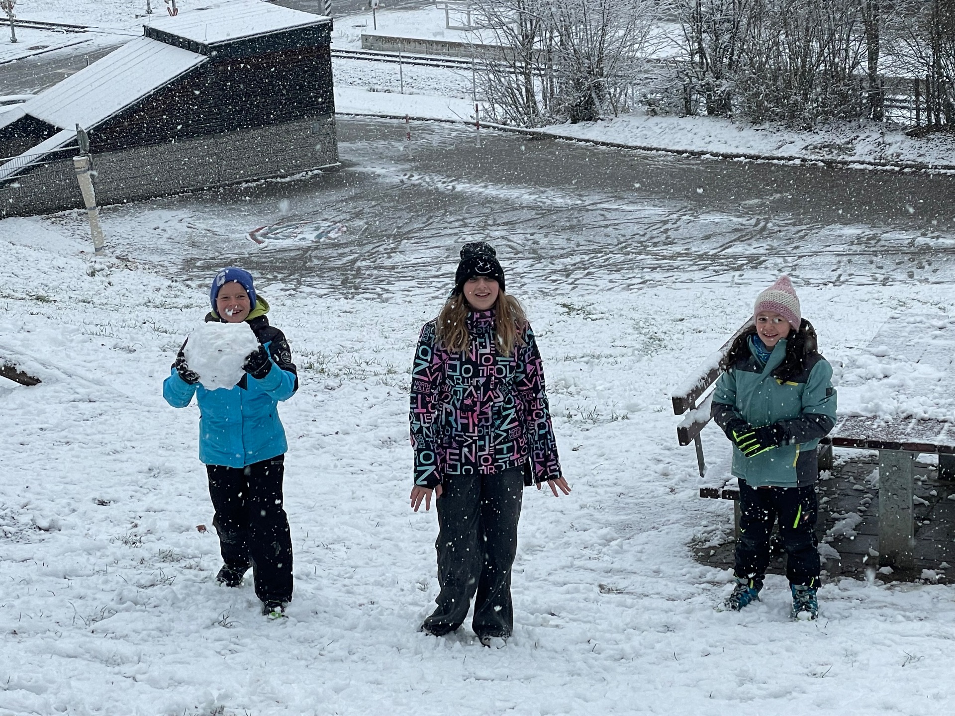 Die Kinder der 2a und 4a genießen den ersten Schnee.