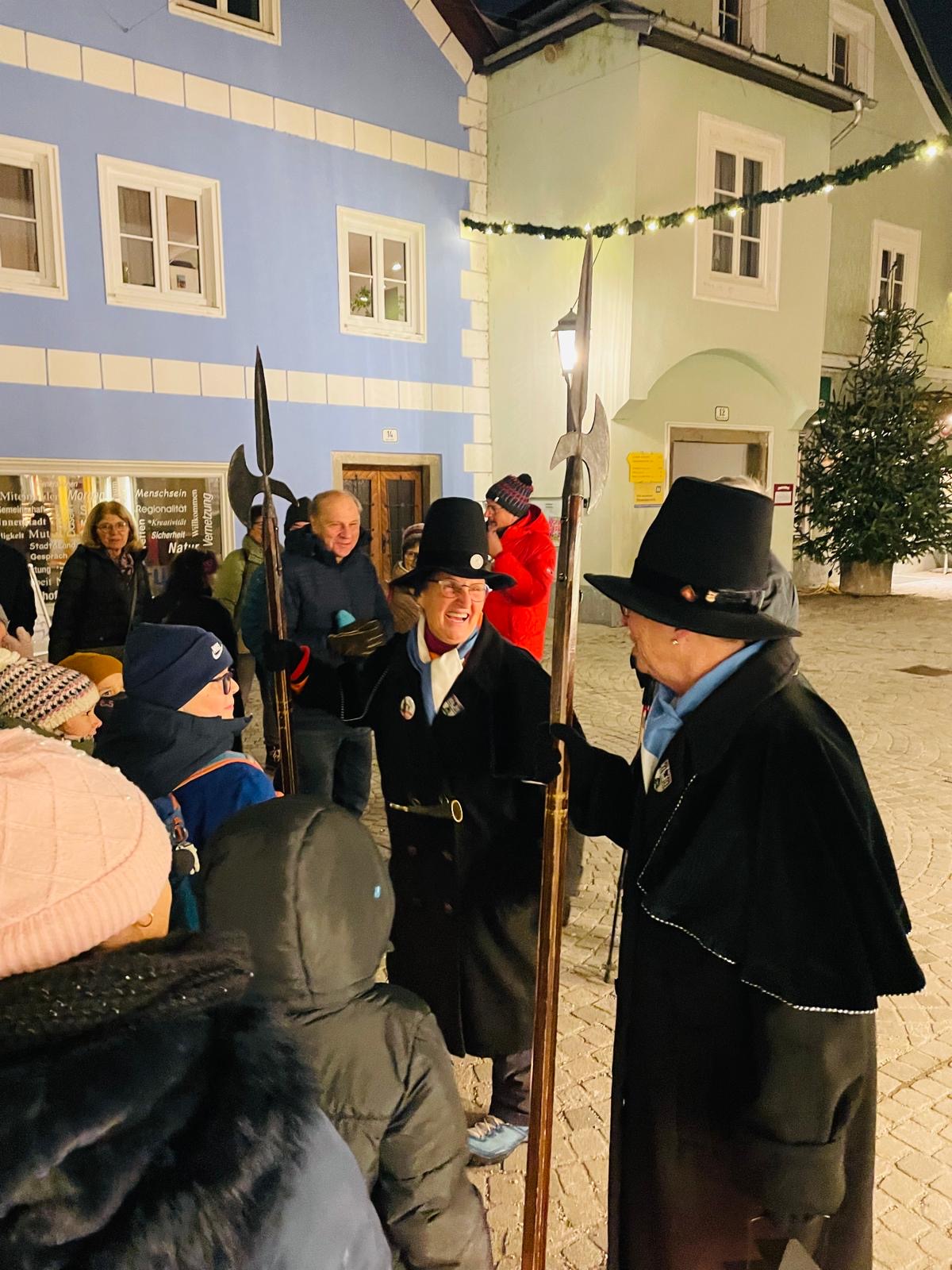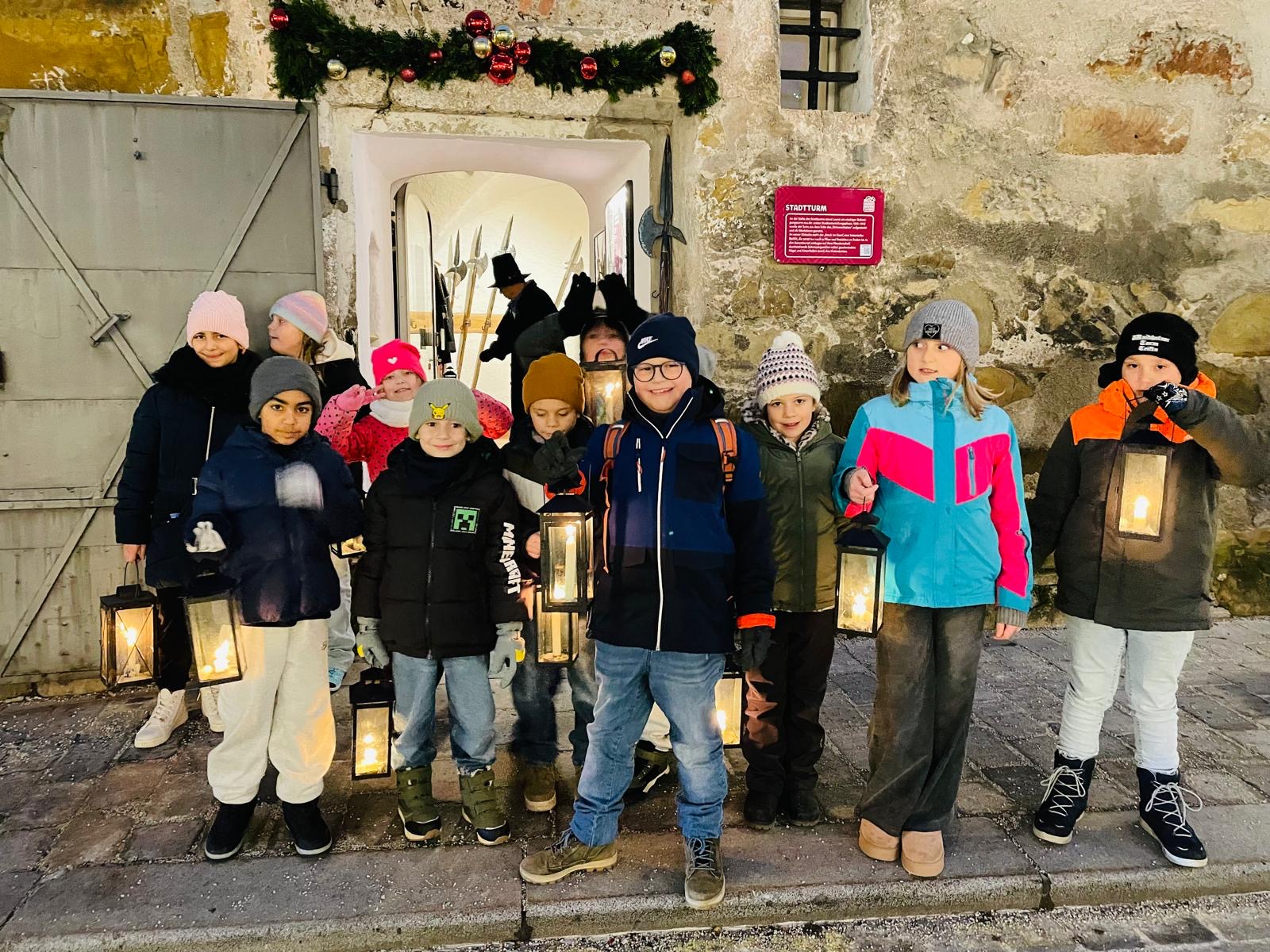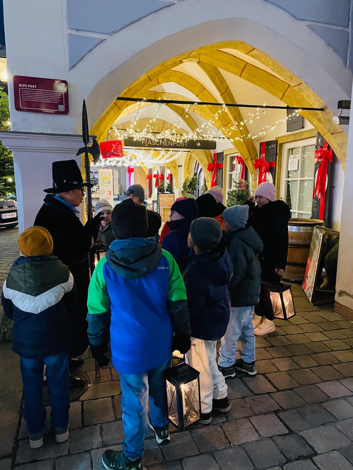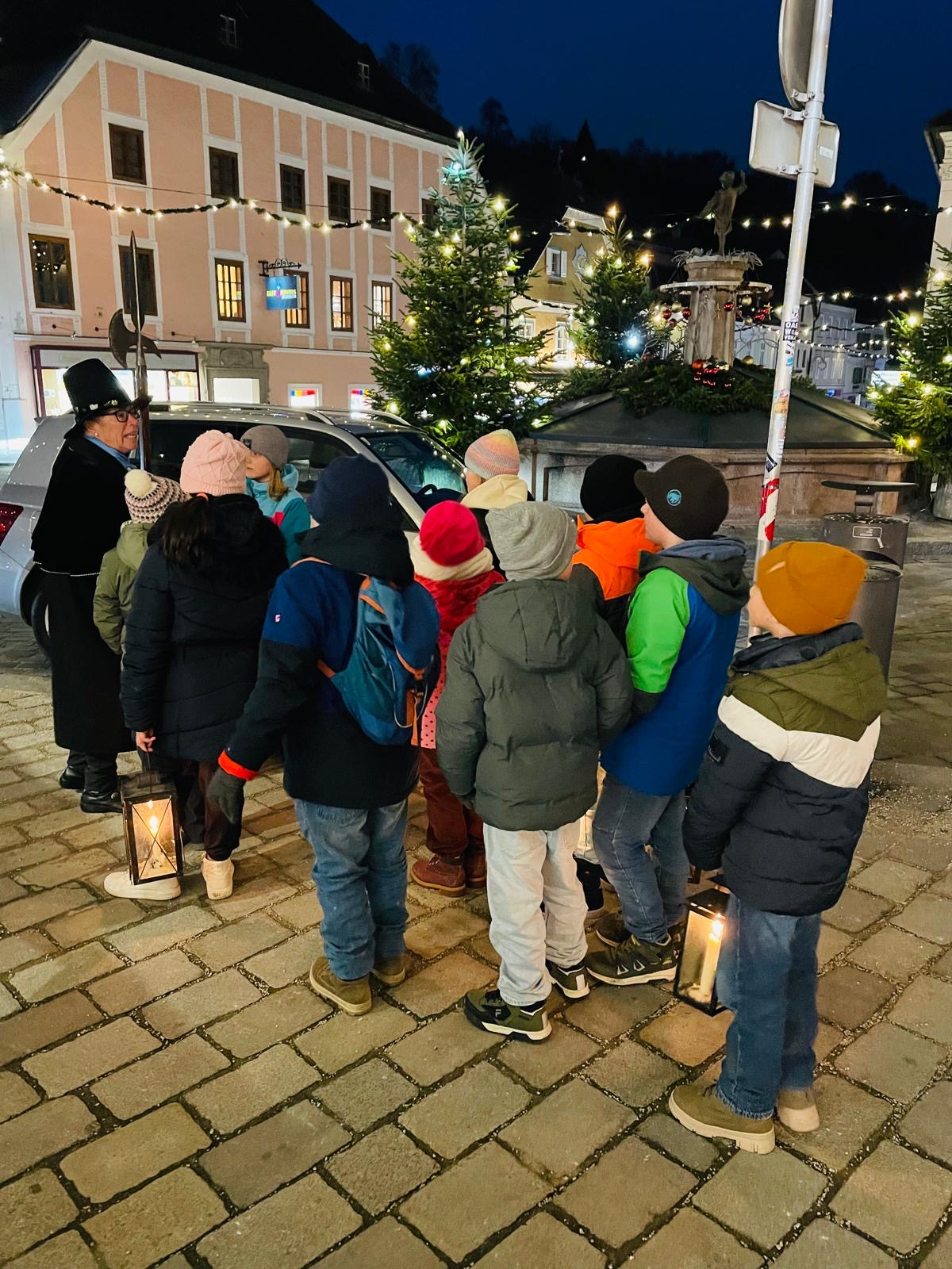 Nachtwächterführung Die Nachtwächterin Doris Dürauer führte die Kinder der 3b durch ein vorweihnachtliches Waidhofen. Herzlichen Dank für die spannende Reise in die Vergangenheit!